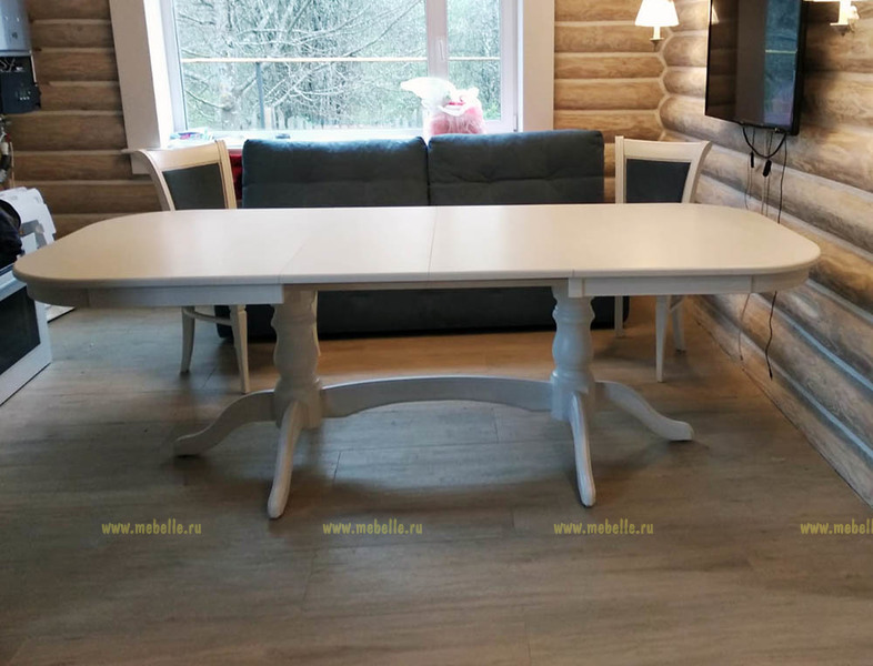 Стол деревянный (береза) с прямоугольной, овальной, прямоугольно-овальной или радиусной столешницей (МДФ со шпоном), на двух ногах. Этот большой стол в раздвижном виде может достигать трех метров.